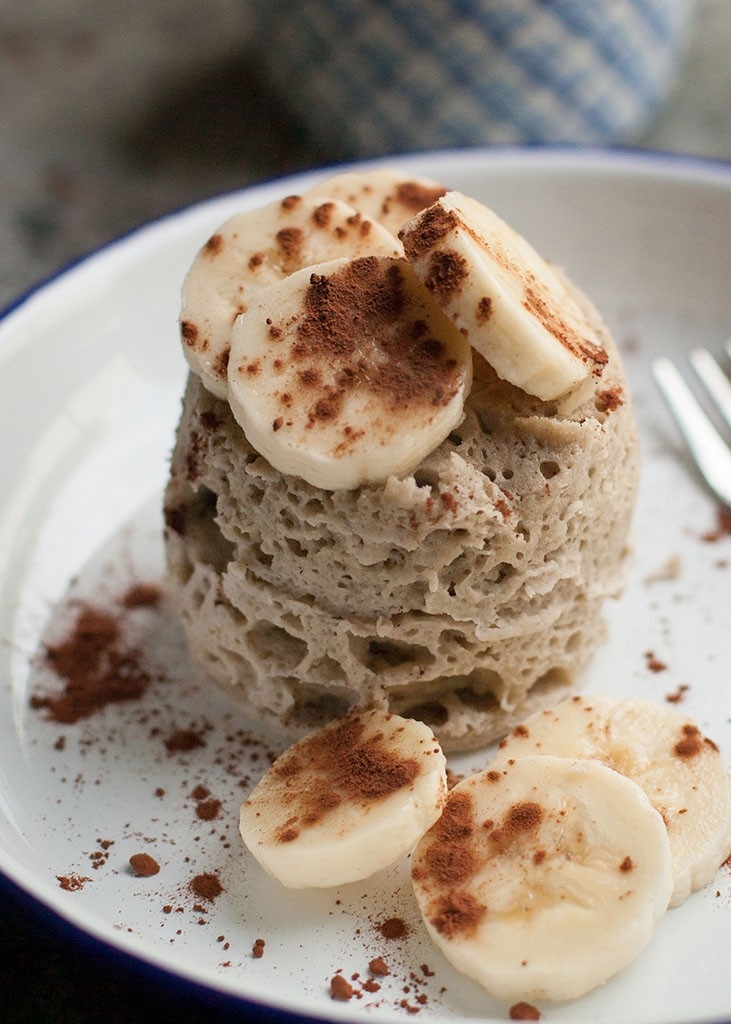 4. Verwarm de mok in 2 minuten in de magnetron tot de mugcake gaar is. Garneer met kwark en een paar plakjes banaan.